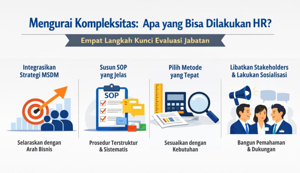 Singkatnya, tanpa evaluasi jabatan yang baik, perusahaan kehilangan kompas dalam mengelola SDM secara strategis. Meskipun dikenal kompleks, evaluasi jabatan tetap bisa dikelola secara sistematis dengan pendekatan yang tepat. Secara umum, ada empat langkah penting yang dapat Sobat Braya jadikan pijakan: