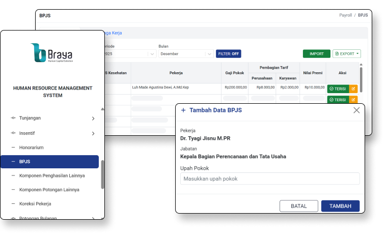 - HR: Memiliki full akses untuk menambahkan, mengelola, dan memperbarui data BPJS pekerja.