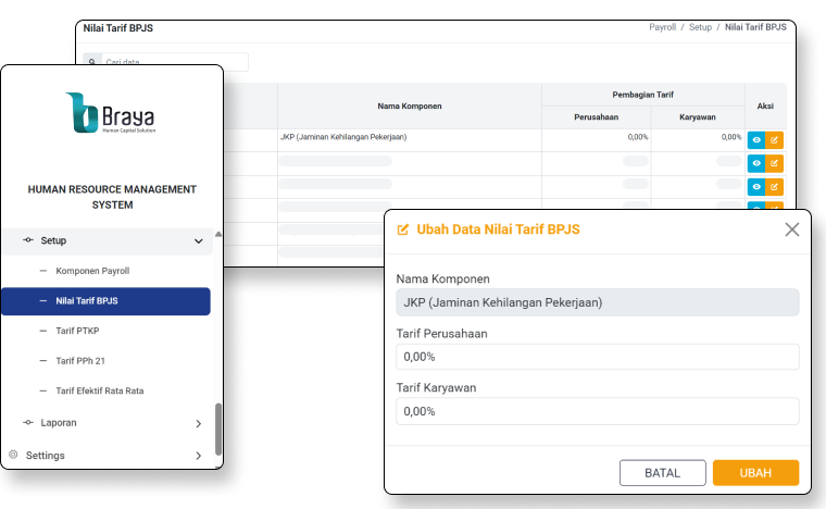 Menu BPJS berfungsi untuk menghitung dan mengelola biaya BPJS Kesehatan serta Ketenagakerjaan pekerja. Menu ini memungkinkan HR untuk menginput nominal kontribusi, memperbarui data pembayaran, dan memastikan seluruh iuran pekerja tercatat dengan benar sesuai ketentuan yang berlaku.