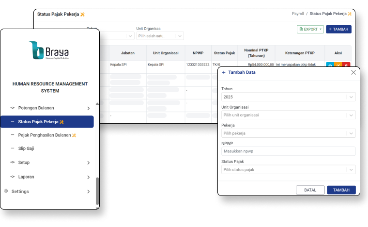 - HR: Memiliki full akses untuk menambahkan, mengelola, dan memperbarui status pajak pekerja.