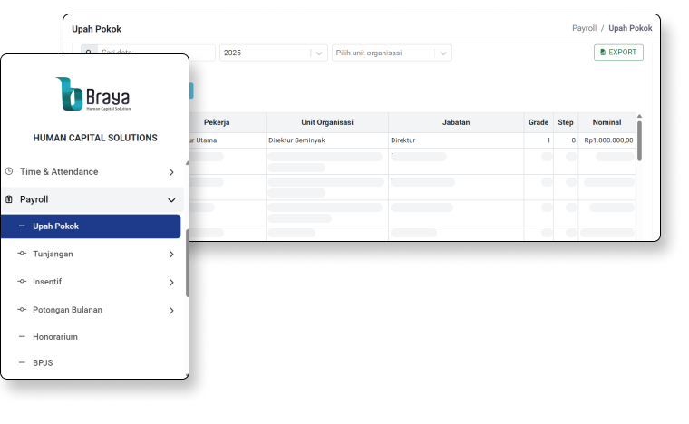 Upah pokok ditentukan berdasarkan grade and step, jabatan, serta data pekerja. Grade and step menggambarkan level posisi dan masa kerja pekerja dalam struktur organisasi. HR dapat mengelola dan memperbarui pengaturan ini langsung melalui menu Upah Pokok.