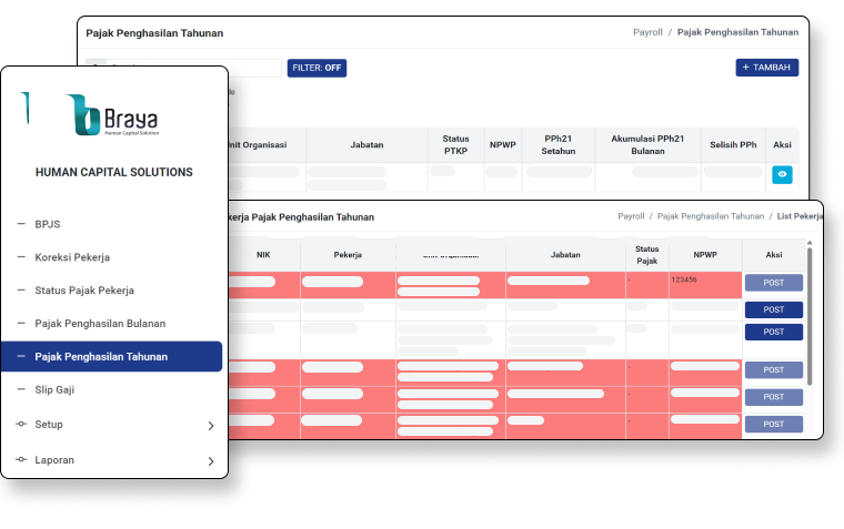Menu Pajak Penghasilan Tahunan berfungsi untuk menghitung, mengakumulasi, dan menampilkan total Pajak Penghasilan (PPh) karyawan dalam satu periode tahun pajak berdasarkan data penghasilan dan status perpajakan. Menu ini membantu HR dan tim terkait memastikan perhitungan PPh karyawan dilakukan secara akurat serta sesuai dengan peraturan perpajakan yang berlaku.