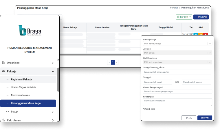 Modul Pekerja digunakan untuk mengelola data utama pegawai, uraian tugas, perijinan khusus, dan penangguhan masa kerja sehingga seluruh informasi pekerja tersimpan rapi dalam sistem.