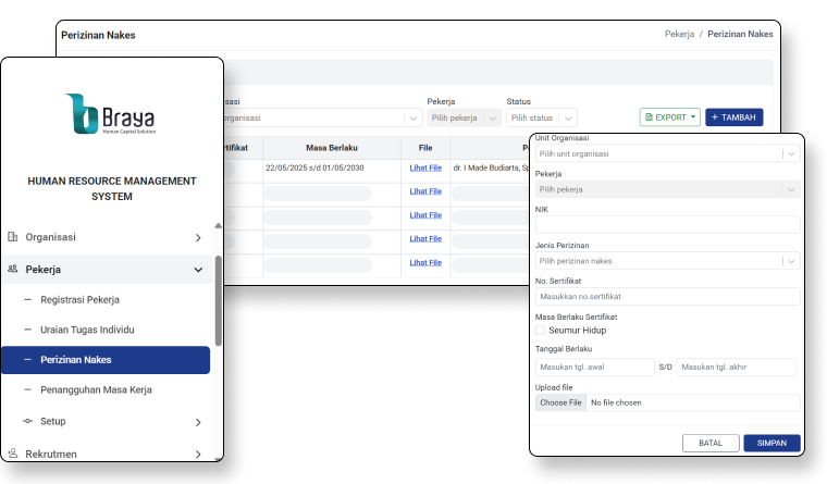 Menu Perijinan Pekerja menyimpan informasi izin atau lisensi khusus yang dimiliki pekerja, terutama bagi profesi yang memerlukan sertifikasi. HR full akses, pekerja bisa read dan update data perizinannya sendiri.