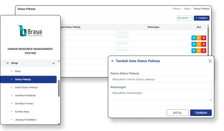 Menu yang berfungsi untuk mengatur data referensi dasar yang digunakan oleh seluruh fitur di modul Pekerja. Melalui menu ini, pengguna dapat menetapkan parameter awal seperti status pekerja, jenis perijinan, dan pengaturan lainnya yang akan menjadi acuan di setiap form dan proses. Data yang diatur di menu Setup akan muncul sebagai pilihan (option) pada menu lain, sehingga memastikan konsistensi, standarisasi, dan keseragaman informasi di seluruh sistem.