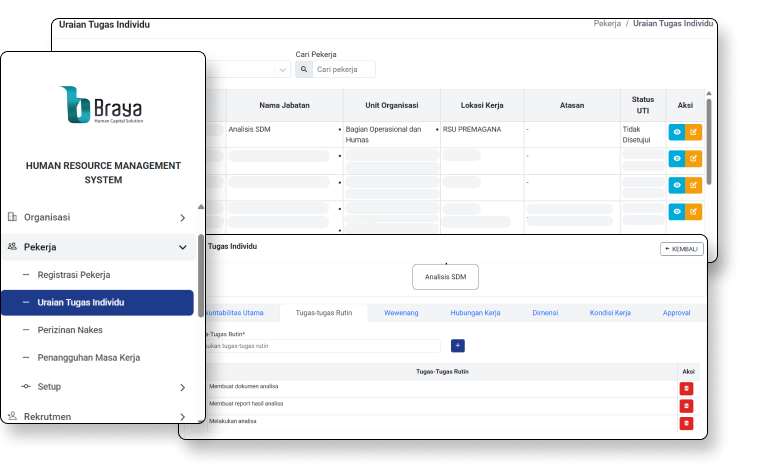 Uraian Tugas Individu menampilkan rincian tanggung jawab setiap pekerja. HR full akses, kepala departemen/manajemen bisa update dan read, sementara pekerja hanya dapat membaca informasi tugas mereka sendiri.
