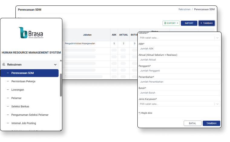 - HR : dapat menambah, mengubah, dan menghapus formasi kebutuhan SDM serta memantau seluruh status kebutuhan secara menyeluruh