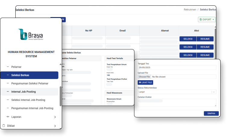 Menu Seleksi Kandidat digunakan HR untuk mencatat hasil screening, tes, dan wawancara. HR dapat memperbarui status kandidat pada setiap tahapan, sementara manajemen dapat memberikan penilaian atau rekomendasi terhadap kandidat untuk posisinya.